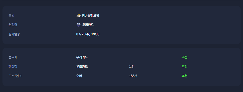 KB 손해보험은 기본 전력과 상대전 우위를 갖추고 있지만 일부 핵심 선수들의 컨디션 변수가 존재합니다. 반면 우리카드는 최근 상승세와 조직력, 공격 안정성에서 우세한 흐름을 보이고 있습니다. 전체적인 흐름과 전력 완성도를 고려할 때 우리카드의 승리가 유력할 것으로 보입니다.