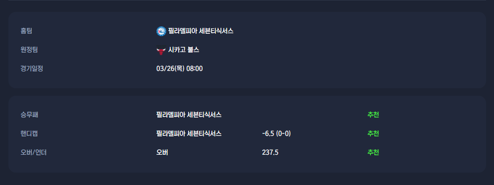 2026-03-26 필라델피아 세븐티식서스 VS 시카고 불스 분석