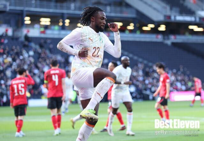 하지만 기회를 놓치자, 선제골이 코트디부아르 쪽에서 나왔다. 코트디부아르는 전반 35분 후방에서 한 번에 긴 패스를 넘겼다. 공이 낙하하는 지점에선 마르시알 고도와 조유민이 경합했다. 여기서 마르시알 고도가 힘을 앞세워 조유민을 넘어섰다. 이후 볼은 쇄도하던 에반 게상에게 가뿐하게 배달됐다. 에반 게상은 골망을 흔들었다.