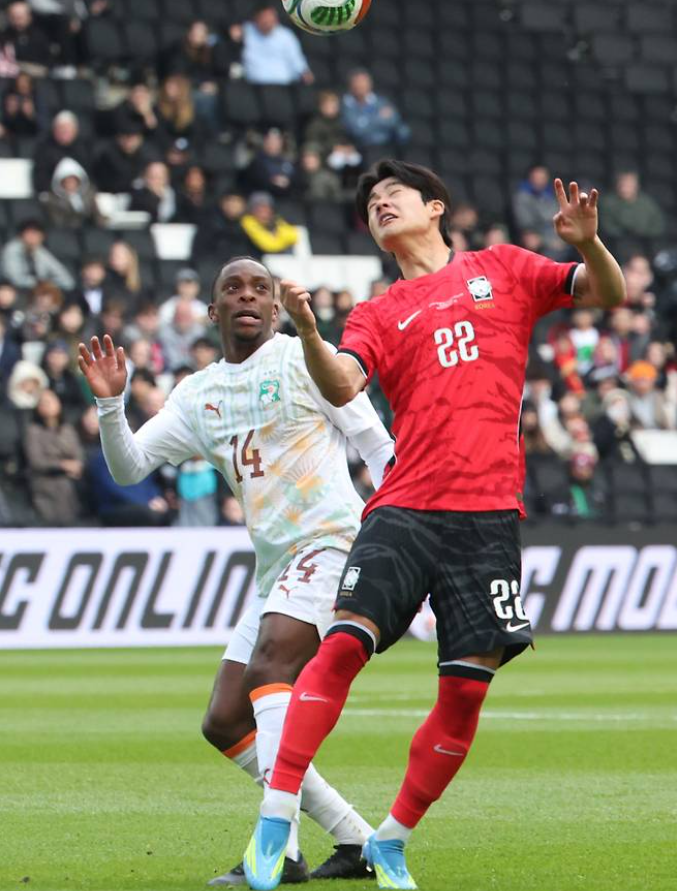 대표팀은 28일 오후 11시(한국시간)부터 영국 밀턴킨스의 스타디움 MK에서 코트디부아르와 3월 A매치 친선전을 벌이고 있다. 대표팀은 국제축구연맹(FIFA) 랭킹 22위, 코트디부아르는 37위다. 대표팀은 전반 35분 선제 실점을 내주며 40분까지 0-1로 밀리고 있다.