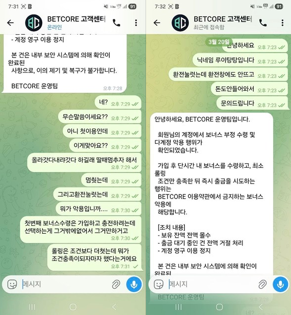 BETCORE (벳코어) 짜짜로니 0 229 03.23 01:14 무기명 가입 이길래 60만원 충전해서 왔다갔다 돈 다플거 같길래 100만원 환전 누르자마자 바로 차단당하네요돈없는 거지먹사에요 충전하면 환전버튼 없어요 절대 충전하지마세요.