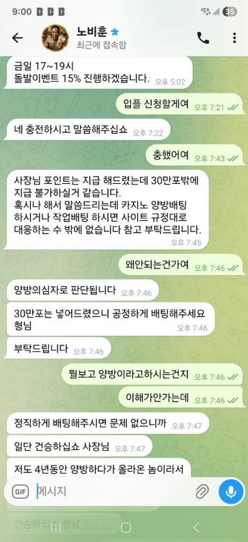 총판은 막무가내 양방이라고 원금처리한다하고 사이트는 총판이랑 소통하라하고 둘다 대화 안되는 쓰레기집단입니다