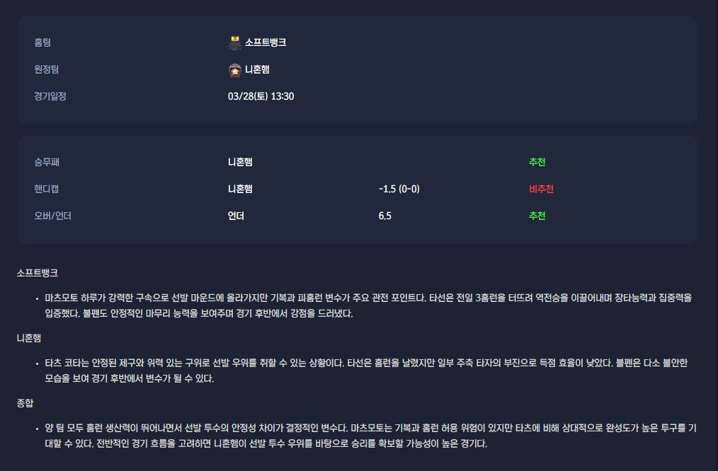 2026-03-28 [NPB] 소프트뱅크 VS 니혼햄 분석